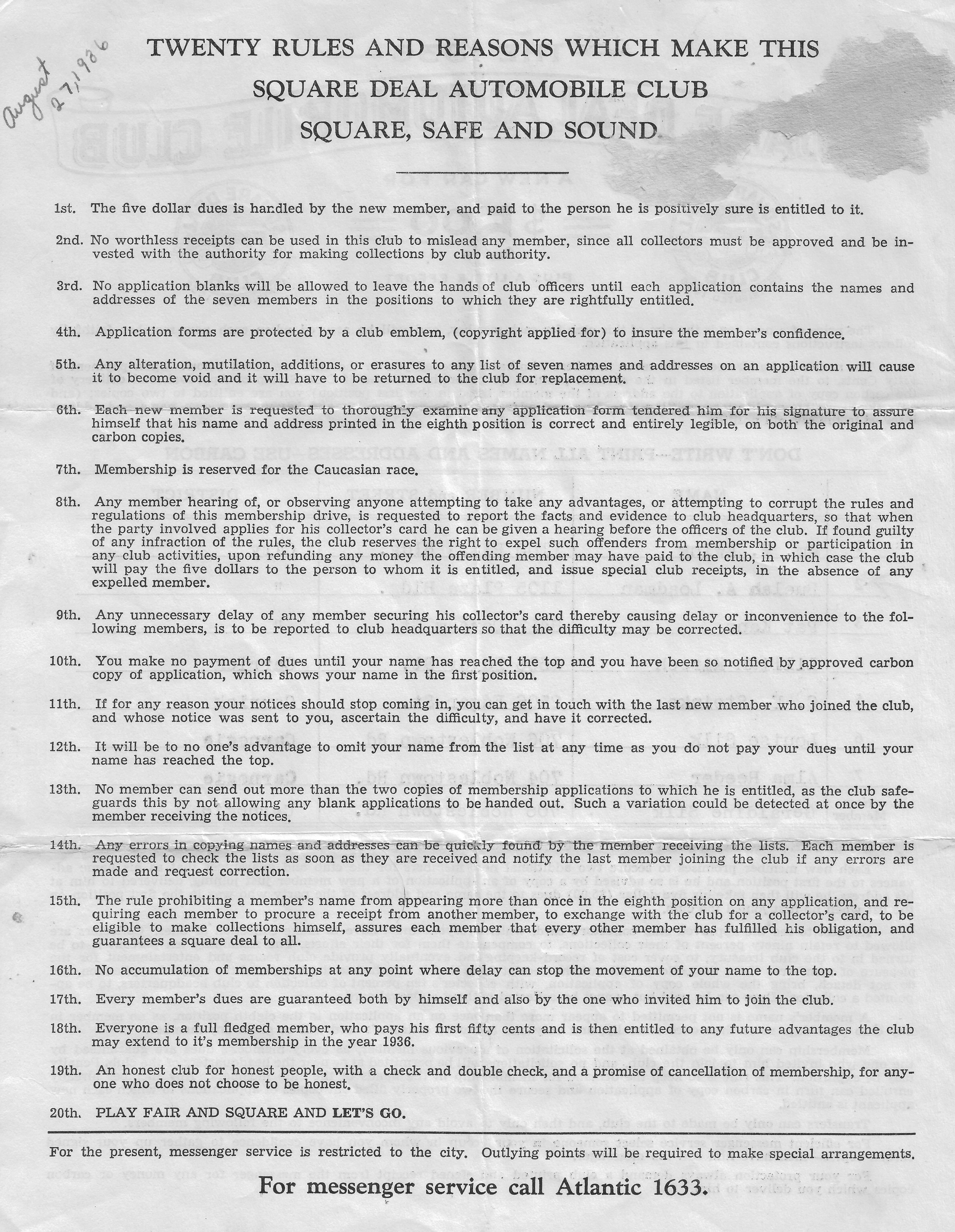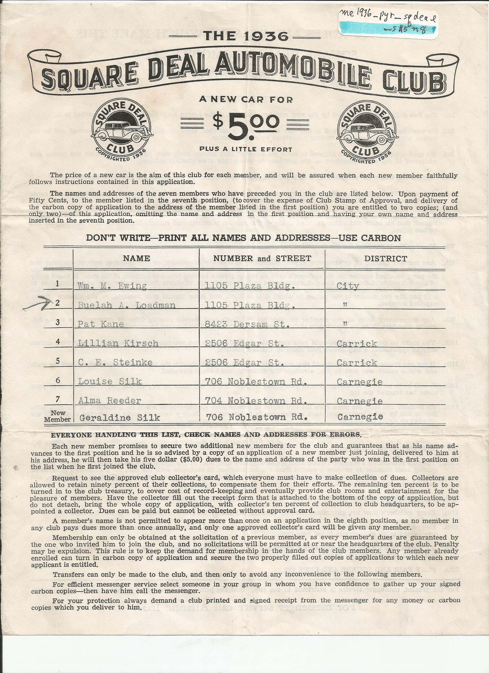 (iii) Though underplayed, the awareness of saturation is present. The complete name of the club is: "The 1936 Square Deal Automobile Club." The benefits of membership (for paying 50 cents dues) in Rule 18 (see back page jpeg) are restricted to "the year 1936." And "a member's name is not permitted to appear more than once on an application in the eighth position, as no member in any club pays dues more than once annually, . . ." Thus we see the club operations were restricted to the year 1936, with the possibility of other clubs in subsequent years. And though not explicitly stated, the headings on the form (no space for city) and use of a local messenger service, imply the Club's activities were restricted to the Pittsburgh area. While looking at the 20 rules on the back page, check out Rule 7! Well, it could be argued that those excluded were done a favor.